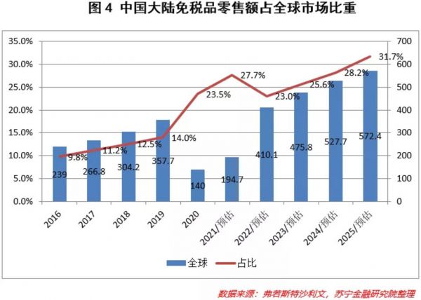 最后来看中国大陆的旅游零售市场的情况(如图3)。2016-2019年间,我国内地旅游零售市场的年复合增长率为25%,其中免税品的年复合增速为28.8%,高于全球和亚洲的增速。2020年,中国政府对新冠疫情的有效控制加之扩大内需和发展免税行业促进消费回流的有力政策,内地的旅游及免税品零售额虽有下跌但跌幅明显小于其他国家。弗若斯特沙利文预计2022-2025年中国大陆免税品零售额的年复合增长率为24.4%,同样超过亚洲和全球,中国大陆免税品市场在全球的占比也稳步上升(见图4)。