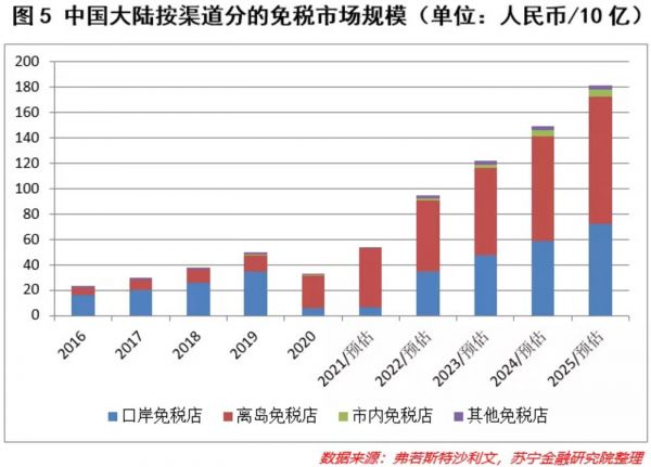 再来看免税行业的渠道情况。从渠道这个角度拆分,免税行业可分为口岸免税店、离岛免税店、市内免税店和其他免税店(例如外交人员免税店、运输工具免税店和供船免税店等)。从图5提供的数据可以看出,口岸免税和离岛免税是免税行业中最重要的两个渠道,2016-2019年间口岸免税和离岛免税的年复合增长率分别为29.4%和30.5%。2019年和2020年,国家大力发展离岛免税,2019年和2020年离岛免税的增长率分别为92.6%和61.1%。弗若斯特沙利文预计2022-2025年期间我国口岸免税和离岛免税年复合增长率分别为27.8%和21.1%。从渠道来看,这几年离岛免税处于风口,未来增长潜力较大的则是市内免税。