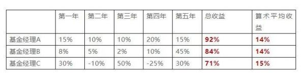 有三位基金经理,他们近五年的业绩分别为下表,请你不要用计算器,凭直觉判断一下,最终谁的收益率最高?