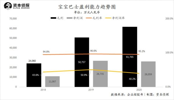 招股书显示,2018年至2020年,宝宝巴士的毛利不断增加,三年来分别为2.4亿、5.07亿、6.18亿,2019年毛利同比增速111%,2020年毛利增速下滑至21.7%;2018年至2020年,毛利率分别为94.76%、96.55%、95.24%。宝宝巴士的毛利率之高令人惊讶,数据稳定在95%左右,甚至优于茅台的一贯表现。但在毛利率高光之下,其整体营收及毛利增速却呈下滑态势。此外,净利下滑趋势更为明显。