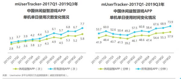 艾瑞UserTracker数据显示,休闲游戏用户单日使用次数和时长稳中有升。在 2017年第一季度到2019年第三季度这段时间中,每个独立设备每天打开休闲游戏的次数增加了3次,每个独立设备每天花在休闲游戏APP上的时间也从41.9分钟增长到了57.9分钟。