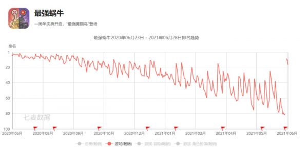 不仅如此,七麦数据显示,截至7月5日,《最强蜗牛》在iOS游戏畅销总榜排名56,总体呈现下滑趋势。