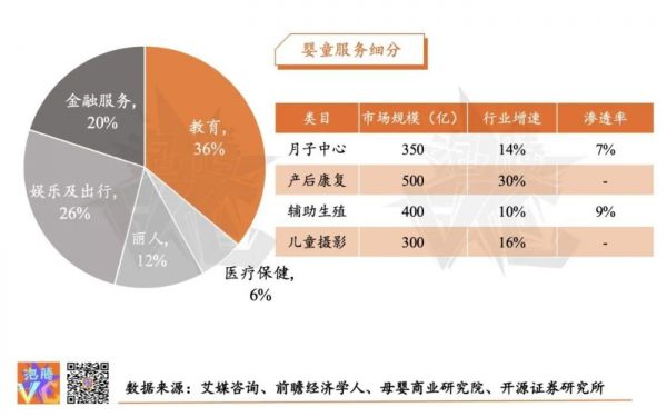 服务层面,随着宝妈对自身健康的关注,以及对专业知识的摄入,月子中心、产后康复需求日益增多。而辅助生殖在三胎政策全面放开的今天也成为一个潜力不小的市场。目前从宏观维度来看,教育、娱乐及出行、金融服务等还是占据服务的更大比重。
