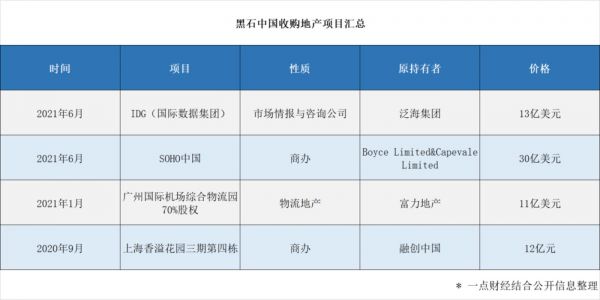 再看2020-2021年黑石收购的三个地产项目:12亿元收购融创持有的上海香溢花园、11亿美元收购广州国际机场综合物流园70%的股权(富力地产持有)、30亿美元收购SOHO中国,规模越来越大,频率也在加快。