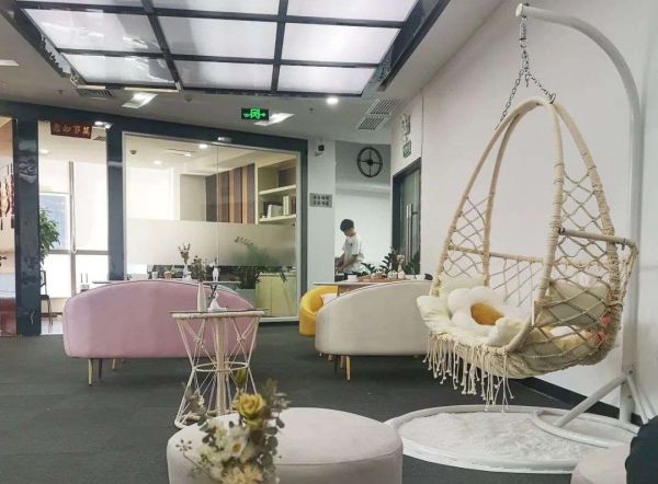 或许是为了契合MCN机构的网红气质,神狼文化前台的左手边放了四台蓝色系的抓娃娃机,右手边则布置了一个少女气息满满的吊篮椅。