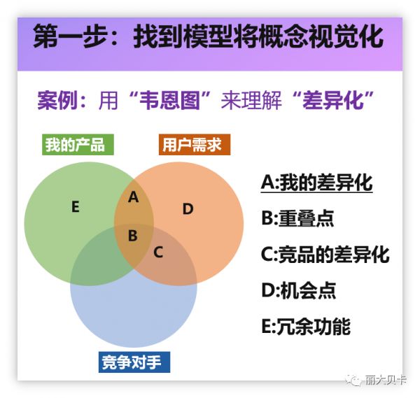 韦恩图是一个平面二维的模型,通过二维图谱中的面积来展现强度。我们可以用韦恩图来理解“什么差异化?””什么不是差异化“这样的问题,然而再进一步追问到底怎么做差异化的时候,就做不到了。