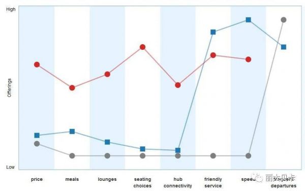 蓝海战略是多维模型,是通过多变量的聚类和摆布来实现差异化,所以用如下图所示的轨道图来中理解和展示会更加生动。因此,我们可以用韦恩图先去找到哪里需要差异化,再用轨道图去布局如何差异化。