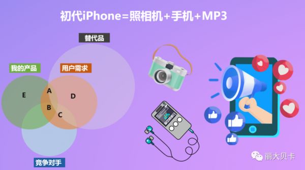 替代品的一个经典案例就是初代iPhone,此物横空出世以后,举世震惊。从此后,原本被相机、收音机、随身听各自为战的市场,通通可以被一个产品满足。消费者不需要再购置多个设备,而只要在一个设备上就可以实现所有的需求,对于消费者来说这是多么的诱人。