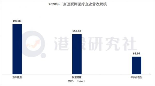从营收体量上而言,2020年财报显示,京东健康凭借194亿元,在三家企业中继续领跑,阿里健康也是首次跨过百亿大关,营收达到155.18亿元,而平安好医生还在六十亿左右徘徊。