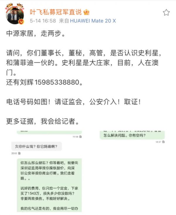此前在今年5月14日,私募基金经理叶飞爆料中源家居曾让其以中间人的身份参与“市值管理”,但却遭遇对方赖账,于是叶飞在微博对中源家居高调喊话。中源家居否认相关事实。此事一出,“叶飞举报门”引发业内广泛热议,证监会表态对操纵市场和内幕交易等违规行为持零容忍态度。