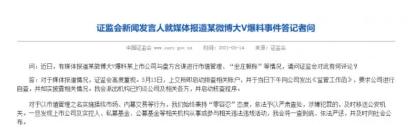 随后,证监会新闻发言人在被问及对某微博大V爆料某上市公司与盘方合谋进行“市值管理”、“坐庄赖账”等情况做何评论时指出,关于媒体报道情况,证监会高度重视。5月13日,上交所即启动排查相关账户,并于当日下午向公司发出《监管工作函》,要求公司进行自查,并如实披露相关情况。证监会派出机构已约谈公司及相关各方,并启动核查程序。