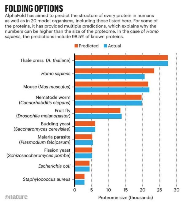 除了人类蛋白质组(人类基因组表达的所有蛋白质约2万种)之外,他们还将提供其他20种具有生物学意义的生物蛋白质组的开放访问,总计超过35万种蛋白质结构,包括从果蝇到小鼠等动物,以及从大肠杆菌到酵母等细菌。
