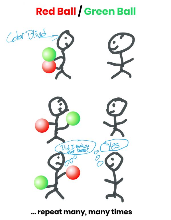 我的朋友是色盲,我们一起都在看桌子上的两个球,两个球的形状是一模一样的,但其中一个是红色的,另一个是绿色的。我告诉他那两个球的颜色一样,但他不确定是不是可以相信我。我们决定通过玩游戏来确定它们其实颜色不一样: