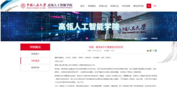 这句话,至今还挂在中国人民大学高瓴人工智能学院的官网上。