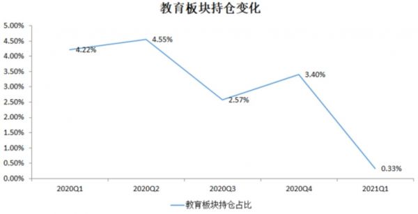 教育板块的持仓占比,已从2020年一季度的4.22%,下降到2021年一季度的0.33%。
