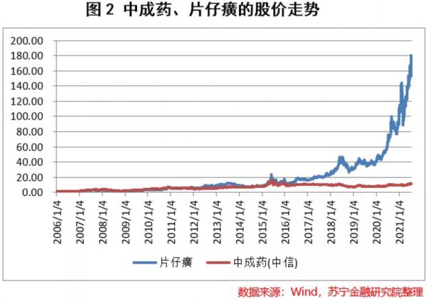 从图1和图2可以看出,片仔癀被称为药中茅台并非浪得虚名。从图1可以看出,2016年以来,中成药的走势开始弱于医药行业整体且两者之间的剪刀差有逐步扩大的趋势;与此同时,中成药上市公司片仔癀却一骑绝尘(见图2),股价涨幅远超同行业的其它中药股,2006年至今其复权股价的涨幅超过150倍。市场给予片仔癀如此巨大溢价的原因是什么?这种溢价能否持续?