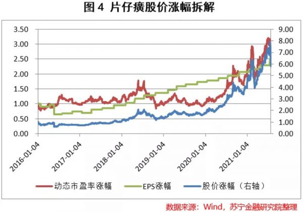 医药制造业和日化两条业务线较高的营收增速和稳定且高水平的毛利率,叠加较低的销售费用率(总体常年稳定在10%以下)和研发投入(研发投入占营收比例2020年在1.5%左右),带动片仔癀每股盈利从2016年的0.89元上升到2020年的2.77元,期间的年复合增速达到32.82%。