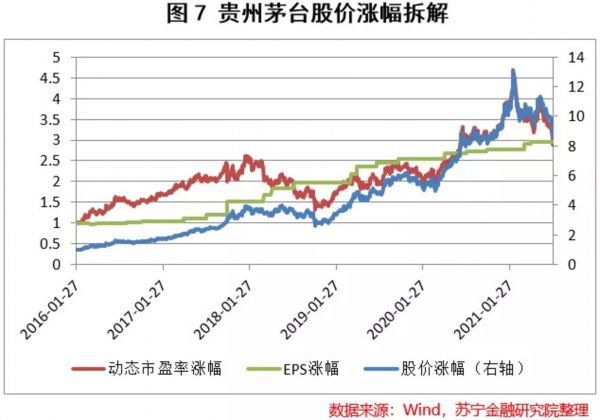 从图5、图6可以看出,中成药、白酒这两个行业在最近1年多的时间内都经历过估值驱动的上涨过程,但最近一段时间以来市场开始了杀估值,白酒中绝对龙头贵州茅台也进入了这样一个阶段。