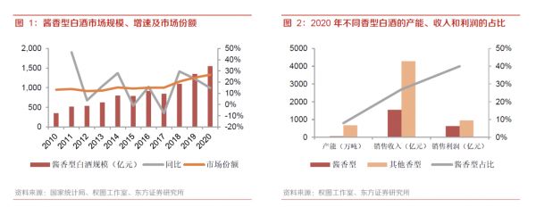国家统计局相关数据显示,2020年酱香型白酒市场规模达到约1550亿元,同比增长了15%。2010年-2020年,国内酱酒市场规模年均增速达到16%,在白酒行业中独树一帜。酱酒占白酒市场份额进一步提升,20 年达到约27%,同比提升3%。