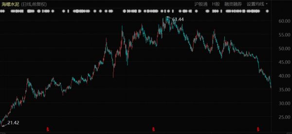 海螺水泥则是自高管发布了一份减持公告开始股价见顶,从8月初开始进入到漫长的下跌过程中,至今股价已经累计下跌了40%;