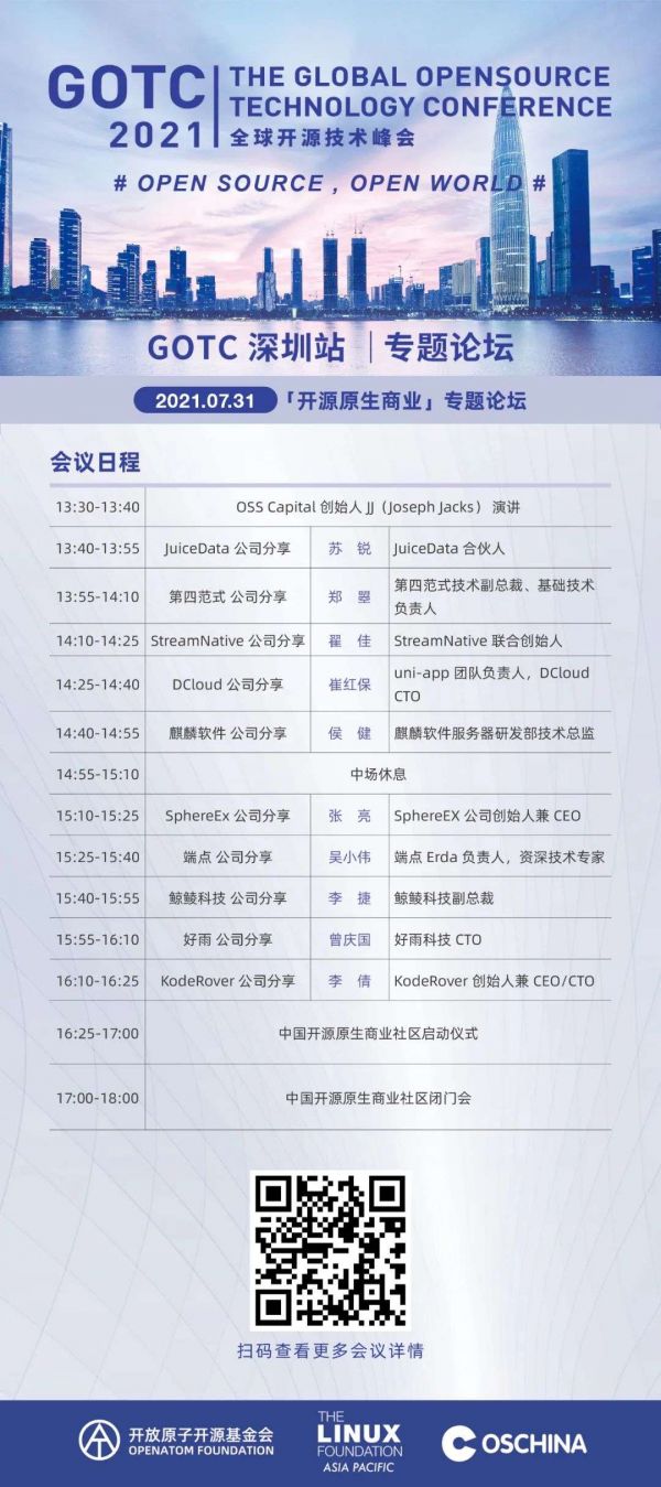7 月 31 日至 8 月 1 日,GOTC 全球开源技术峰会深圳站会在深圳会展中心与大家见面,继续开源之旅。同时,GOTC 2021 深圳站特设「开源原生商业」专题论坛,正式启动中国开源原生商业社区。