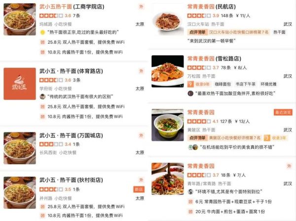 在大众点评App上搜索,内参君发现了一些热干面区域品牌。比如,武汉的蔡林记是旅游必去打卡之地;另一个品牌常青麦香园的门店也已经突破千家,主打社区店;在山西,内参君发现一家名为武小五热干面的门店遍布颇广,大部分布局在高校附近。