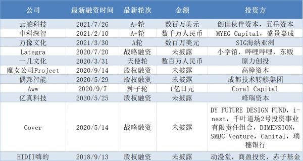 目前,虚拟偶像行业的创业公司多为技术提供商,它们实现虚拟偶像的动作捕捉、图像合成、AI动作处理和图像处理等技术。2021年间,一些公司获得了A轮,A+轮等融资,融资金额在百万元至数千万人民币左右。