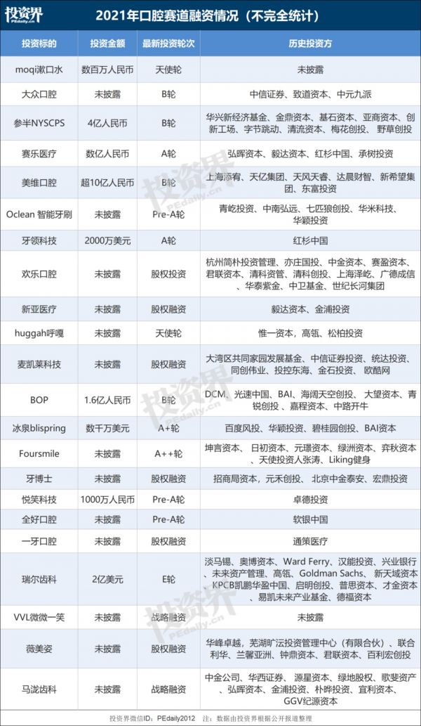 这已经成为上半年最吸金的赛道之一。据投资界不完全统计,2021年上半年已有至少20家公司获得融资,金额超50亿,包括参半、美维口腔、Oclean智能牙刷、huggah呼嘎、BOP、冰泉blispring、薇美姿.....一批新品牌涌现。
