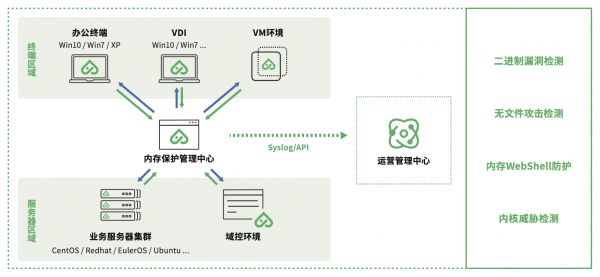 而安芯网盾的内存安全产品,核心原理是从计算机体系结构出发,任何需要CPU执行的代码、处理的数据都需要经过内存进行存储。通过监控CPU指令可以监控内存代码和数据状态,通过内存虚拟化等技术来监控内存的读、写、执行行为可以有效防御各种威胁。从更基础的角度理解,冯·诺依曼的计算机体系结构决定了任何数据都需要经过CPU运算,其数据都需要经过内存进行存储,理论上基于CPU指令集实现的安全方案,可以有效防御所有威胁造成的核心数据泄露风险。而硬件虚拟化的技术得益于现代CPU的硬件支持,「安芯网盾」通过采用CPU的虚拟化特性,能够实时监测内存状态和程序行为状态,并在第一时间识别威胁且进行响应。