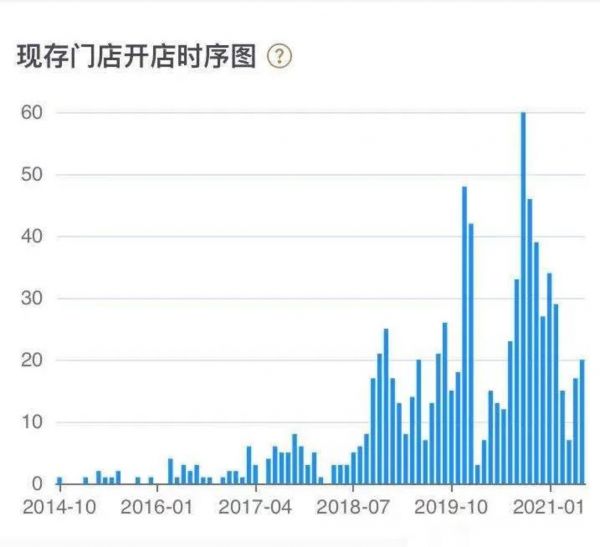 伴随喜茶融资次数一同走高的,是其门店扩张速度。据今年2月喜茶官方公布的2020年度报告显示,喜茶在全球61个城市共有695家门店,其中2020年新进入18个城市、新开304家门店。而据窄门餐眼数据显示,目前喜茶“开业”门店815家,“暂停”营业门店13家。
