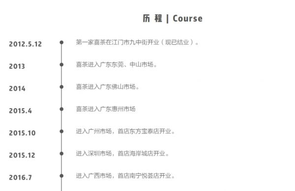 2012年5月12日,喜茶创始人聂云宸的第一家只有20平米的奶茶店,在广东省江门市九中街顺利开张,取名皇茶ROYALTEA(即喜茶前身),制作了第一杯芝士现泡茶的内测版本——奶盐绿茶,以原创芝士茶为起点,喜茶逐步崛起,一个新茶饮时代就此开启。百人排队购买喜茶的热潮情景,出现在各大街小巷。