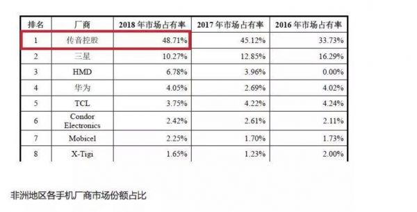 在传音招股书显示,其2018年在非洲市场占比为48.7%,第二名的三星则为10.27%。(不过根据IDC数据显示,在2018年的非洲智能手机市场上,传音、三星和华为分别以34.3%、22.6%和9.9%的市场份额位列前三)