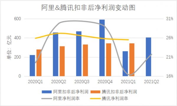 腾讯尚未公布今年二季报,但2019年一季度到2021年一季度总营收的年复合增长率约为25.82%。将两家巨头近一年来营收和扣非后净利润绝对值及同比增速放在一起对比,阿里的业绩也并不差,最近两个季度的净利润受到反垄断罚款的影响而下降幅度较大。(注:阿里集团营收绝对值和变动情况均排除了合并高鑫零售的影响。)