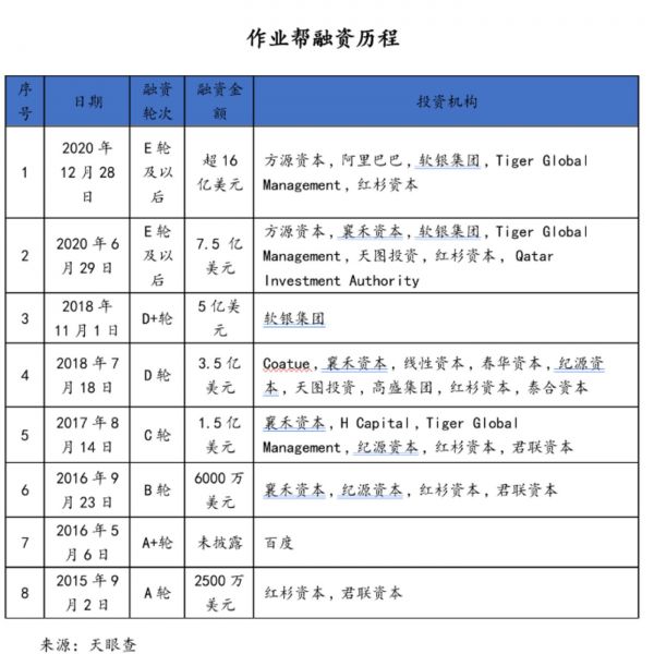 “作业帮”也在2020年完成了E和E+两轮融资,估值达到了110亿美元。