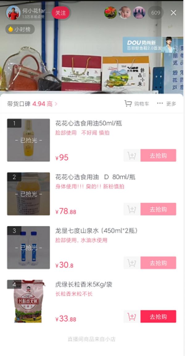 “可能大米是我自己家种的,大家都说好吃,觉得我人挺好的,也会买我其他产品。”在何家红的直播间里,大米是作为引流的产品,市场上卖6-8元/斤的长粒香大米,在她的直播间只卖到3元左右。