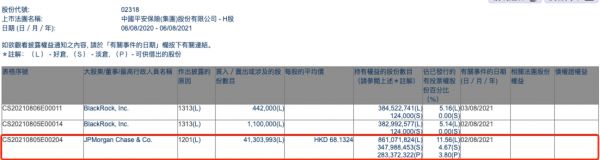 中国平安:摩根大通减持约28.14亿港元,持股比例降至11.56%