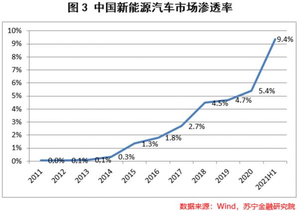 国内新能源车不断渗透。从图3中我们可以看出,在经历了2018-2020年三年的平台期后,今年上半年,新能车的市场渗透率快速攀升至9.4%。我们做个简单的测算,中汽协预测到2025年中国汽车销量有望达到3000万辆,这样的估计已经比较温和,根据新能源车的未来发展路线图,若届时新能源车销量占比达到20%,新能车总销量将达到600万辆,以2020年的销量为基数,新能源车销量的年复合增长率有望达到34.4%的持续高增速水平。