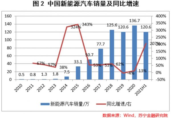 新能源车市场呈现出“供给创造需求”的特征。政策端的大力扶持将会加大新能源汽车的供应,并弱化传统车对其的竞争。从需求端来看(见图2),2021年上半年,新能源汽车销量达到120.6万辆,与2019年同期相比增长92.3%,年复合增长率为38.7%。值得关注的是,2021年上半年,国内汽车总销量为1289万辆,与2019年同期相比仅增长4.6%,年复合增长率为2.3%。也就是说,与2019年同期相比,汽车整体的销量小幅增长,而新能源汽车的销量却出现了井喷,接近翻番,这反映出了新能车对传统车辆的快速替代效应。