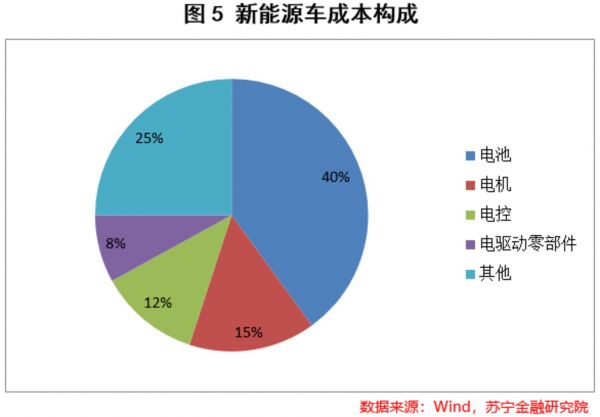 电池、电机、电控是新能源汽车的核心三大件,总成本占整车成本的三分之二(见图5),且成本较为刚性,短时间内难有突破,这也使得同级别的新能源车与传统车相比没有价格优势。