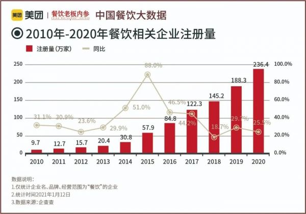 第二,餐饮从业门槛低,中小企业众多,对于普通创业者这可能是创业最快,成本相对较低的行业。根据企查查的数据2020家注册餐饮企业数量为236万家,近五年企业注册数量平均增长率在30%左右。相比之下,历来以企业数量多闻名的房地产和物流,在2020年数量只有10万家和30万家左右。