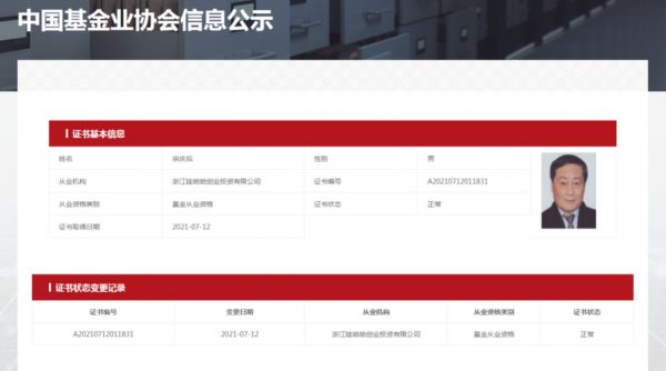 实际上,娃哈哈创投早在2010年11月8日就已正式成立。只不过一直到今年7月9日,才正式在基金业协会完成备案。这一次随宗庆后一同完成基金从业资格的,还有6位其他工作人员。