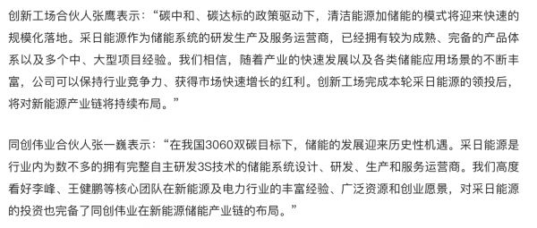 在团队方面,采日能源研发团队拥有160以上的专业人员,其中65%以上拥有电力、电子、电池等行业10年以上工作经验。创始人李峰在新能源行业工作多年,在新能源技术、制造、投资开发等行业都有丰富的经验。