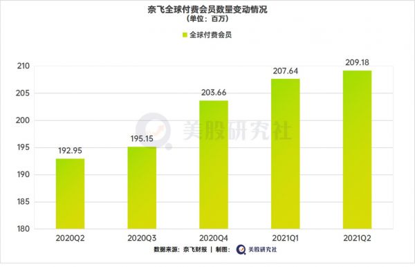 在视频流媒体上,从Netflix最近几个季度的付费用户增长情况来看,因疫情受益2020Q1、Q2、Q3季度同比分别增长23%、27%和23%,增长较为强劲。本季度,奈飞的第二季度会员数据略超预期,会员规模净增长154万使全球付费会员数量达到2.09亿,华尔街的增长一致预期是110万。