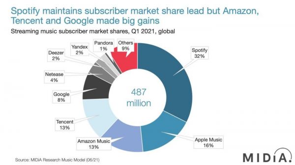 根据MiDIA发布报告称, 2021年第一季度全球音乐流媒体付费订阅用户总量是4.67亿。其中,Spotify付费用户量最高,约1.5亿,占市场份额32%,Apple Music付费用户量约7400万,占16%,腾讯音乐和亚马逊音乐的付费用户量超过6000万,各占13%。