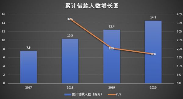 截至2020年底,累计借款人数为1450万。2018年到2020年的三年里,年度同比增速分别为37%、20%和17%。