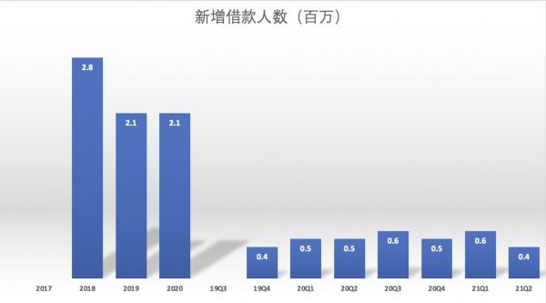 如果从季度新增借款人数来看,同样面临放缓的情况。本季度与上一季度相比,新增借款借款人数为40万,低于第一季度60万的净增,以及2020年第四季度50万的净增人数。