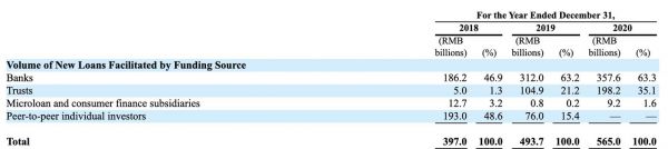 陆金所控股零售贷款业务的资金来源主要是银行和信托。截至2020年12月31 日,公司51家银行和6家信托公司合作为我们发放的贷款提供资金。银行、信托公司经营的信托计划以及公司小额贷款和消费金融子公司分别为公司2020年促成的新贷款提供了 63.3%、35.1% 和 1.6%。
