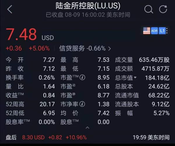 财报发布后,陆金所控股盘后涨逾10.96%,报8.30美元。