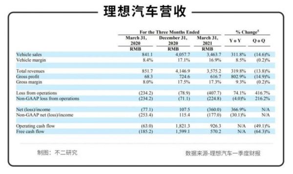 理想2021年一季报显示:其一季度总收入为35.75亿元,同比增长319.8%,环比2020四季度下降13.8%;与此同时,其一季度净亏损3.6亿元,去年同期净亏损为0.77亿元,同比亏损幅度进一步扩大。此外,理想毛利率在一季度下跌。