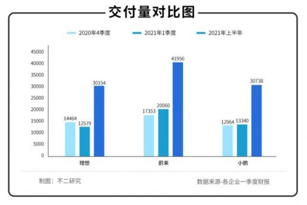 此后,理想逐渐追上队伍。2021年上半年,理想交付量30154辆,小鹏30738辆,蔚来41956辆。